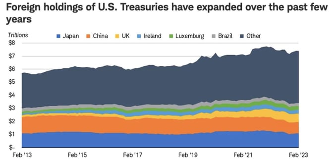 Joey looked carefully at the chart. “It doesn’t look like any other individual currency is threatening US dominance,” he said. “That’s why I still don’t think we’ll convince people. Besides, over the past decade, foreign governments have increased their investments in US government bonds. They wouldn’t have done that if they didn’t have faith in the US dollar.”